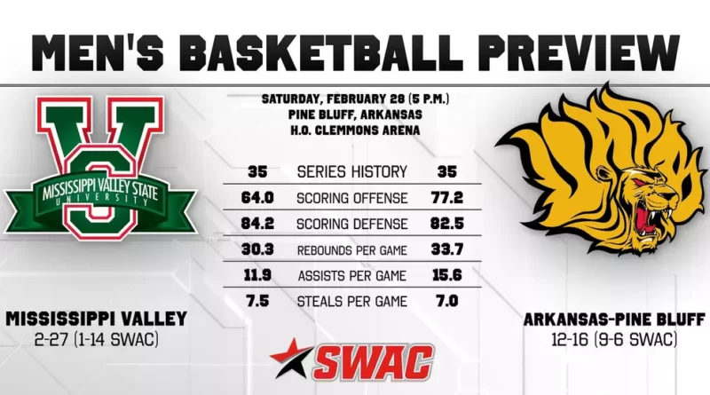 The Mississippi Valley State University men’s basketball team will play its final road game before the SWAC tournament on Saturday at Arkansas-Pine Bluff. The game is scheduled for 5 p.m. at H.O. Clemmons Arena in Pine Bluff, Arkansas.